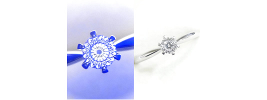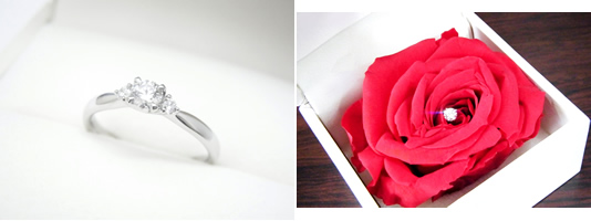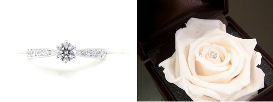 薔薇にセットしたダイヤモンドでプロポーズ。 そのダイヤモンドを持ってふたりでデザイン選び。 これなら彼女の指サイズも好みのデザインもわからなくても安心してプロポーズできます。
